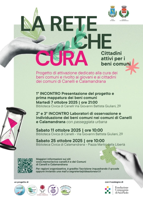 Seguiranno due incontri dedicati alla scoperta del patrimonio urbano, culturale e naturale dei due Comuni, durante i quali i partecipanti individueranno i beni comuni di cui prendersi cura e le possibili azioni di valorizzazione. Il primo appuntamento è per sabato 11 ottobre 2025 alle ore 10:00 a Canelli, presso la Biblioteca Civica, mentre il secondo incontro si terrà sabato 25 ottobre 2025 alle ore 10:00 a Calamandrana, con ritrovo presso la Biblioteca Civica di Calamandrana in Piazza Martiri della Libertà.