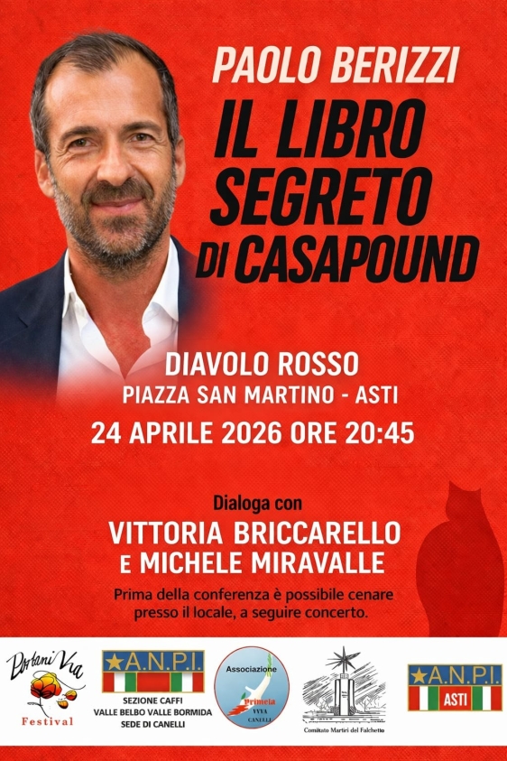A dialogare con l’autore saranno Vittoria Briccarello e Michele Miravalle.L'evento è promosso dalle ANPI di Asti e Canelli in collaborazione con Portami via Festival, Associazione Memoria Viva Canelli e Comitato Martiri del Falchetto.