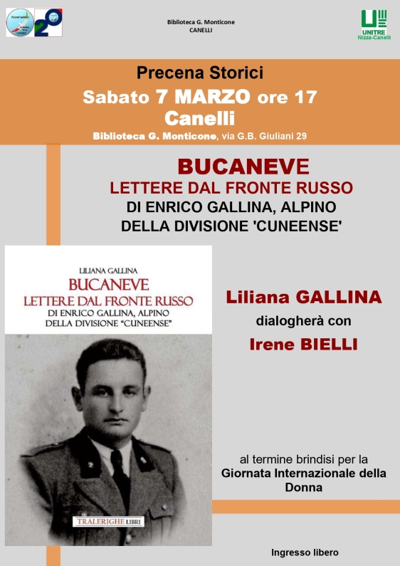 Il breve ciclo di incontri di questa edizione dei Precena Storici, organizzati da Memoria Viva nella Biblioteca G. Monticone di Canelli (via. G.B. Giuliani 29), si concluderà con Liliana Gallina, che sabato 7 marzo, ore 17, presenterà il proprio libro BUCANEVE. Lettere dal fronte russo Di Enrico Gallina, alpino della divisione «Cuneense» (Tralerighe Libri). Enrico Gallina, di Santo Stefano Belbo, alpino della Divisione Cuneense, partì per il fronte russo sul Don nell’agosto del 1942. Questo libro contiene le sue 96 lettere inviate alla famiglia, grazie alle quali è possibile ripercorrere le sue esperienze, le sensazioni e le preoccupazioni vissute in quel periodo. A inizio gennaio del 1943 Enrico Gallina fu catturato con i resti della Divisione e, dopo essere sopravvissuto alla marcia del Davai, morì nel campo di prigionia sovietico numero 56 di Uciostoie.