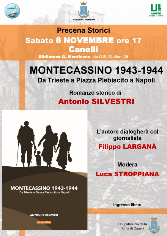 Sabato 8 novembre 2025 alle ore 17.00, presso la Sala Aliberti della Biblioteca Civica G. Monticone, in via G.B. Giuliani 29, Canelli, sarà presentato dallo stesso autore, Antonio Silvestri, il suo romanzo “Montecassino 1943-1944 – Da Trieste a Piazza Plebiscito a Napoli” , pubblicato da Team Service Editore.
